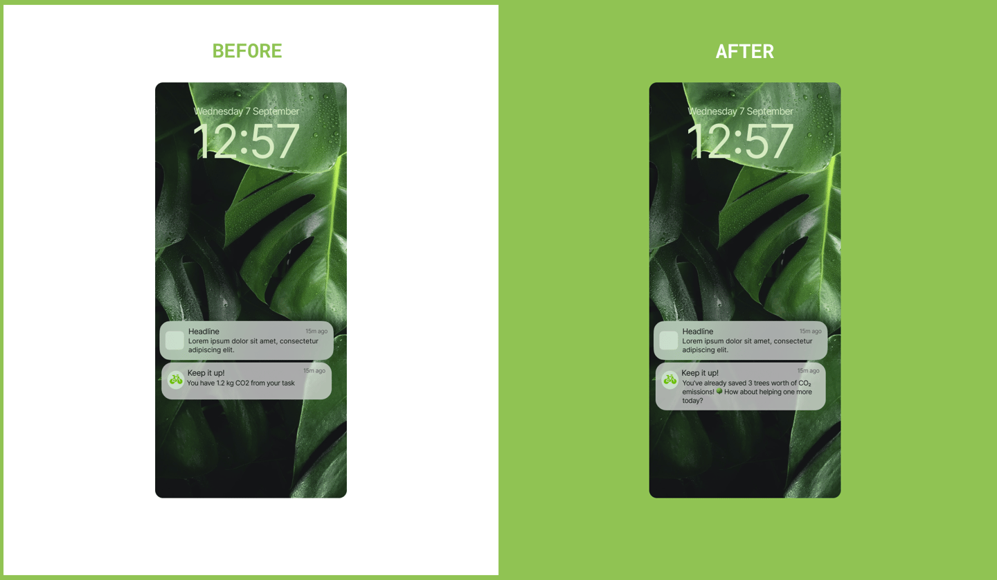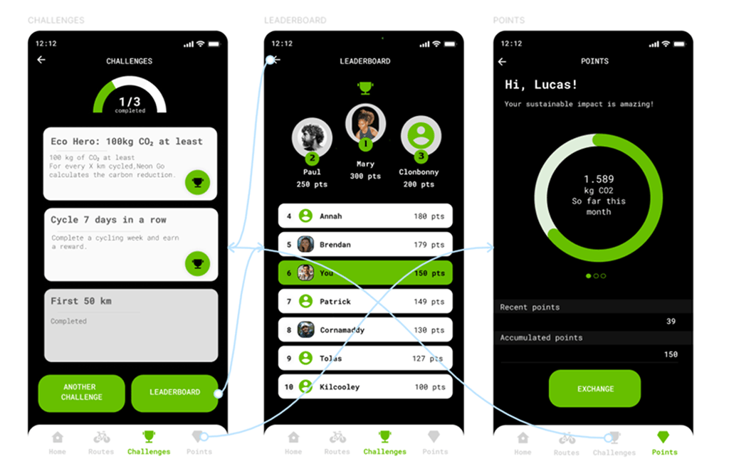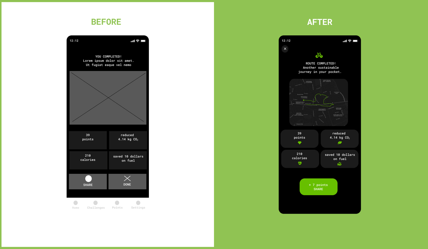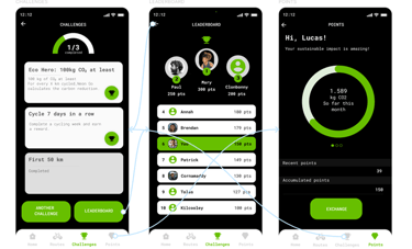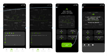 2- To further excite users, more visually impactful dashboards and notifications were created, highlighting CO₂ savings, money saved, and comparisons with car usage.