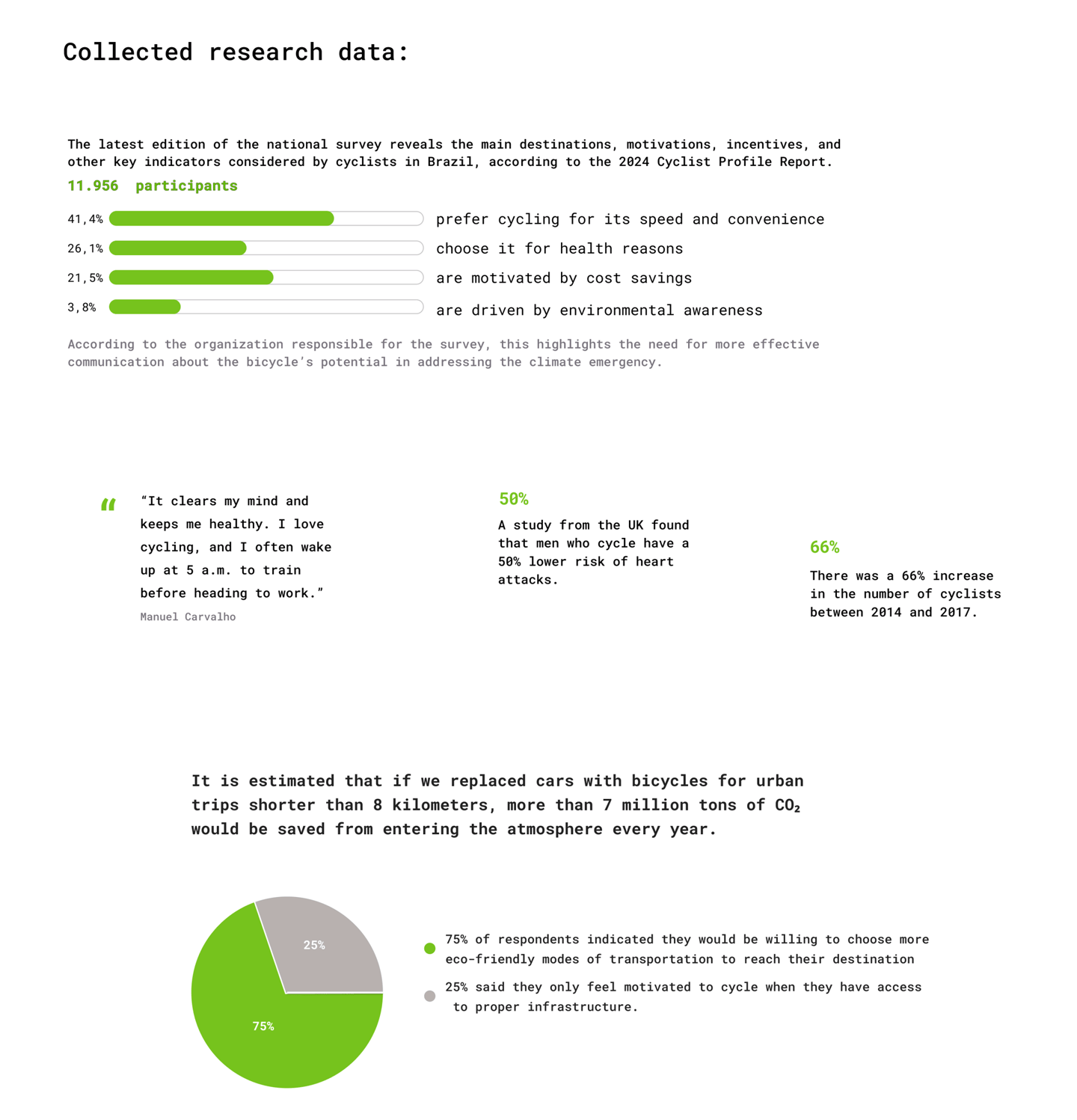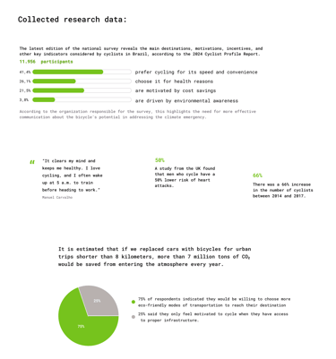 The goal was to gain a deeper understanding of target users and their needs, while identifying behaviors and barriers that hinder the adoption of more sustainable mobility options. I conducted user interviews and performed in-depth secondary research to collect data on sustainable transportation, user behavior, CO₂ emissions, car dependency, and challenges related to public transit.